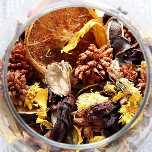 チュベローズのしっかりとしたフローラル、少しスパイシーでエキゾチックな香りが広がるポプリです。カーリーポッドやオレンジスライス、マリーゴールド、スターアニスなど、色とりどり9種の植物のポプリです。生活空間のアクセントとして心を癒してくれます。
